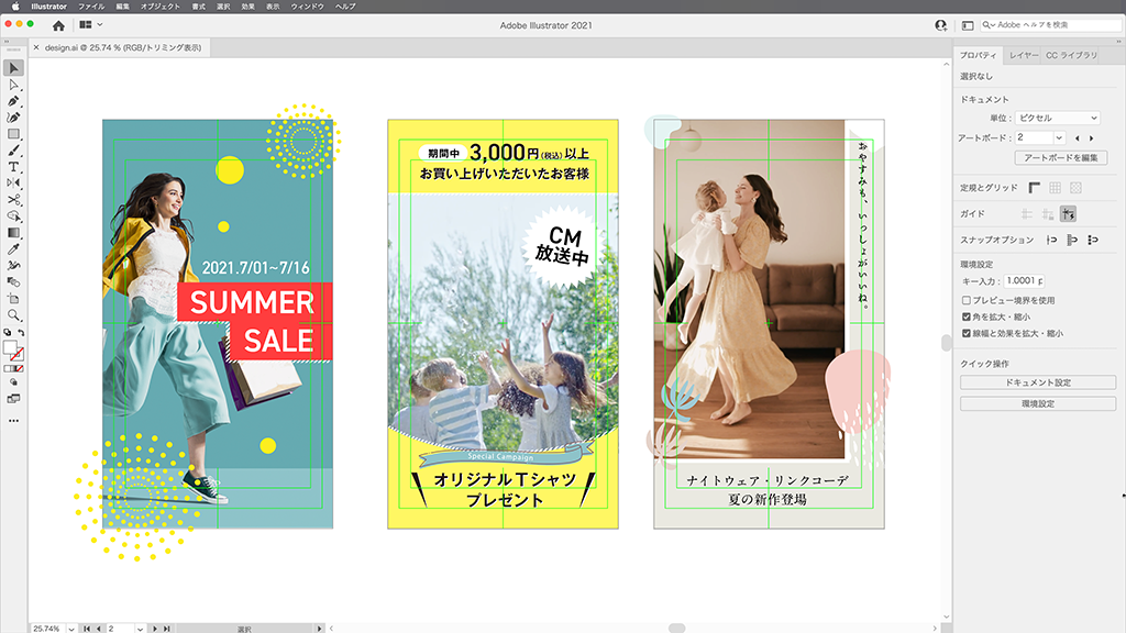 写真や動画のスクリーンショットを配置したレイヤーの上にIllustratorでデザインをしていくと実際のイメージを掴みやすいでしょう。