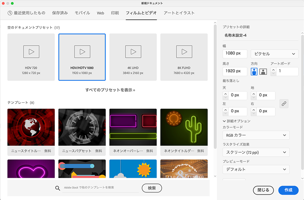 このチュートリアルでは、店頭などに設置される「デジタルサイネージ」用途の1920px × 1080pxのmp4形式のムービーを作成します。モニタを縦で利用することを想定して、縦方向の動画を作成します。