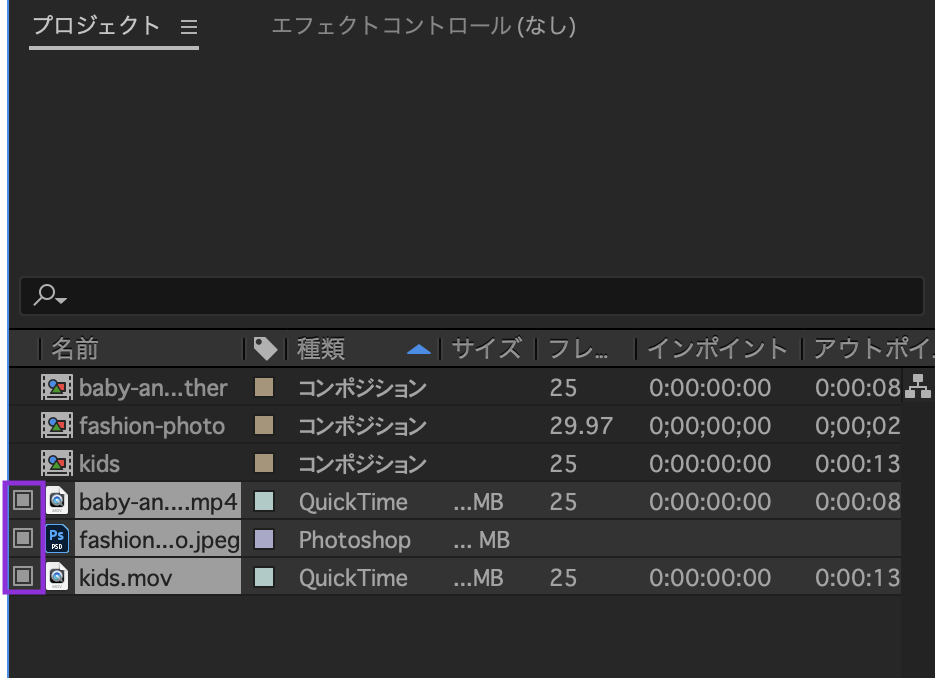 はじめに、使用する動画のmp4素材を左側のプロジェクトパネルへドラッグ&ドロップします。mp4やjpeg、movファイルなどが「フッテージ」として登録されました。