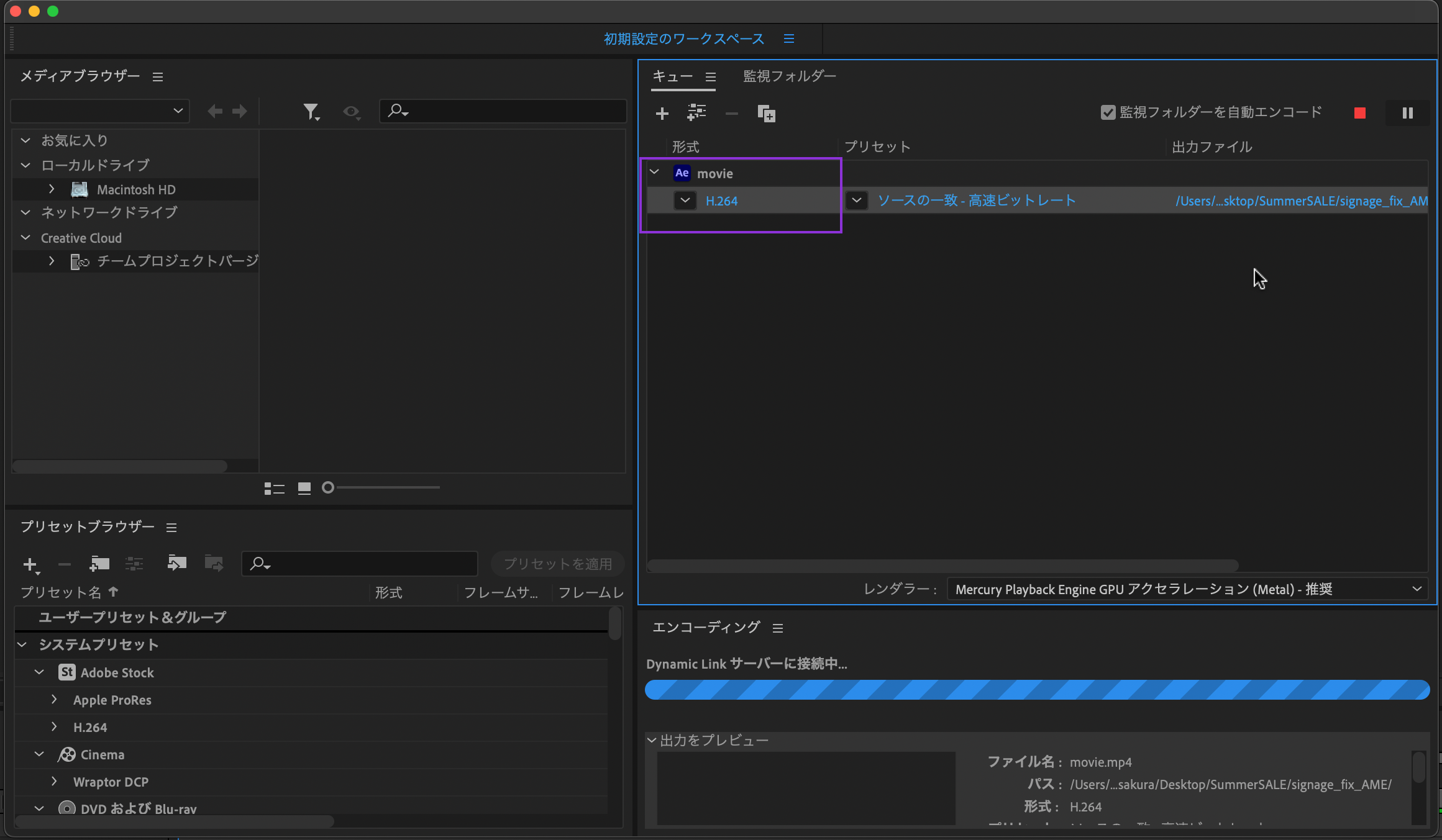 完成したら、[コンポジションメニュー]→[Adobe Media Encoder キューに追加…]を選択して、H.264形式で書き出してみましょう。