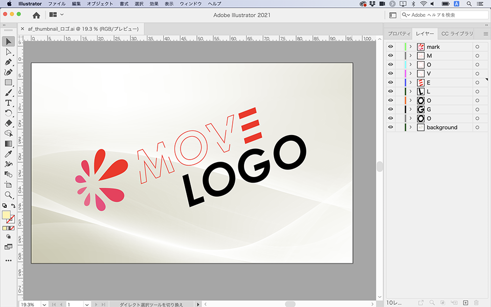 レイヤーパネルのラベル部分(上の画像の右側にあるピンクや薄緑色の四角形)をクリックするとレイヤーに色をつけられるので、「MOVE」と「LOGO」の各4文字はそれぞれ別の色をつけて区別しておきます。