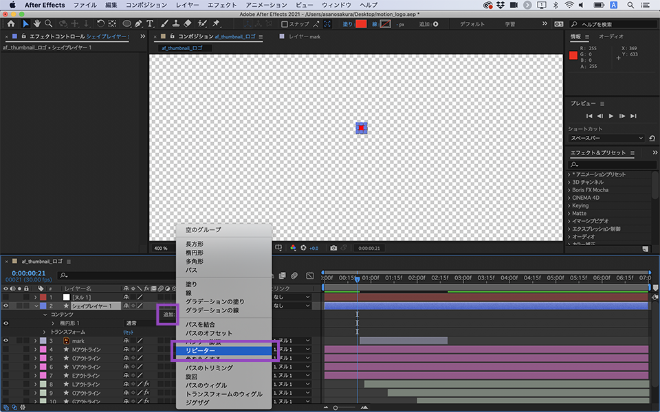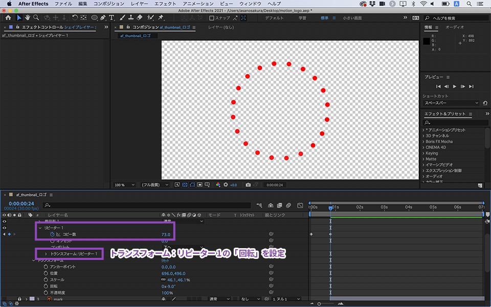 Illustratorデータの読み込み、シェイプレイヤー、トランスフォーム、リピーター、ヌルオブジェクトレイヤー、グラフエディター、イージング、パスのトリミング
