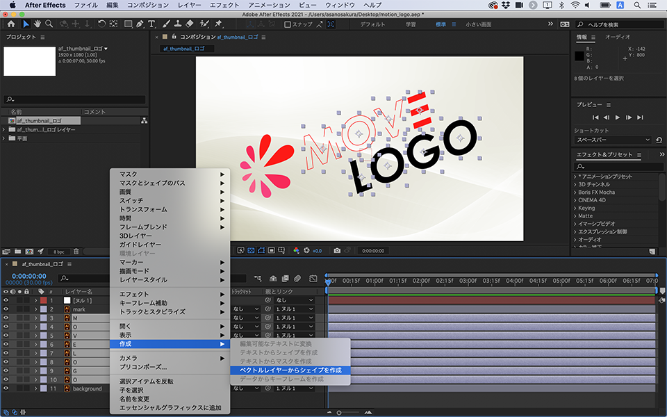 ベクターデータをシェイプレイヤーに変換して、個別にモーションを掛けるための準備をおこないます。Illustratorを読み込んで作成したレイヤーを選択して右クリックし、[作成]→[ベクトルレイヤーからシェイプを作成]を選択します(シェイプレイヤーは頭に★マークが付きます)。