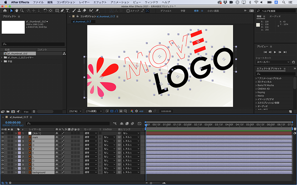 コンポジションのサイズ変更に伴ってロゴのオブジェクトが画面からはみ出してしまう場合は、ヌルオブジェクトレイヤーでグループ化した上で、サイズを調整するのがおすすめです。