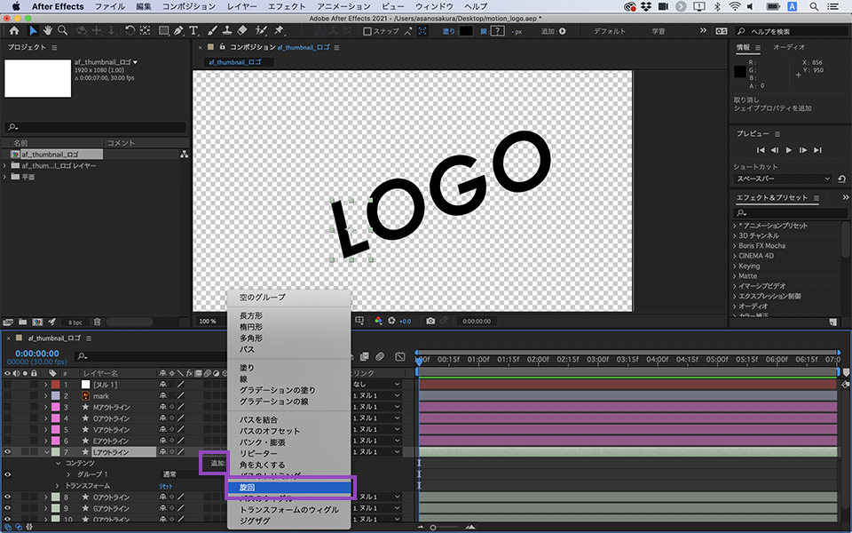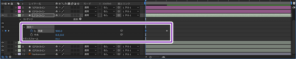 ”L”のシェイプレイヤーを選択し、レイヤーパネルの[>]マークをクリックしてプロパティを展開し、「コンテンツ」の中から[追加:]→[旋回]を選択します。