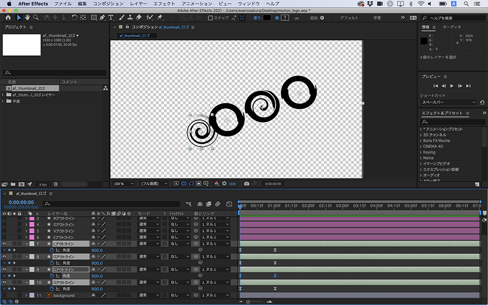 イージングを掛けた2つのキーフレームを選択した状態でCommand(Ctrl)+[C]でキーフレームをコピーし、ほかの「O」「G」「O」のシェイプレイヤーにCommand(Ctrl)+[V]でペーストすると、旋回が他の文字にも適用できます。