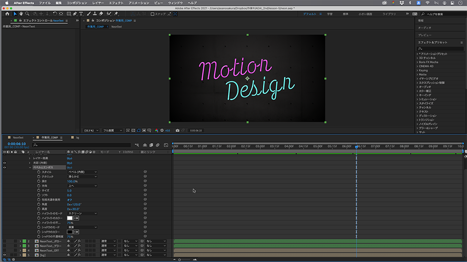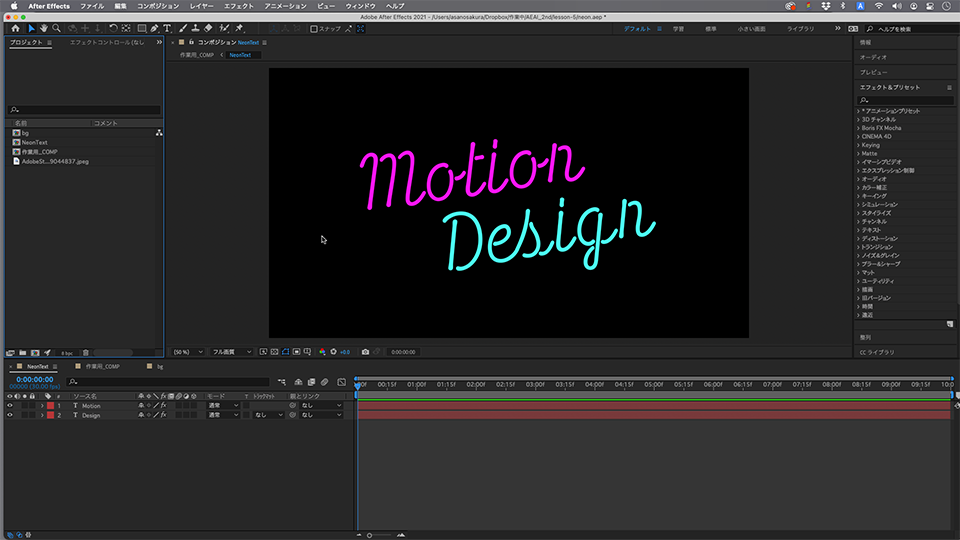 ネオンのテキストは、「NeonText」のコンポジションを作成したあとで、「NeonText」を「作業用_COMP」へ複数回ドラッグすることで、同じ元データ(テキストのコンポジション)を使って別のレイヤーへ異なる効果を掛けることができます。