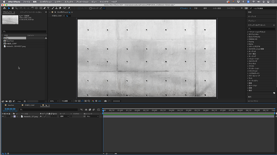 「プロジェクトパネル」から、「作業用_COMP」を開き、この「bg」を「作業用_COMP」のレイヤーパネルへドラッグしてレイヤーとして扱います。