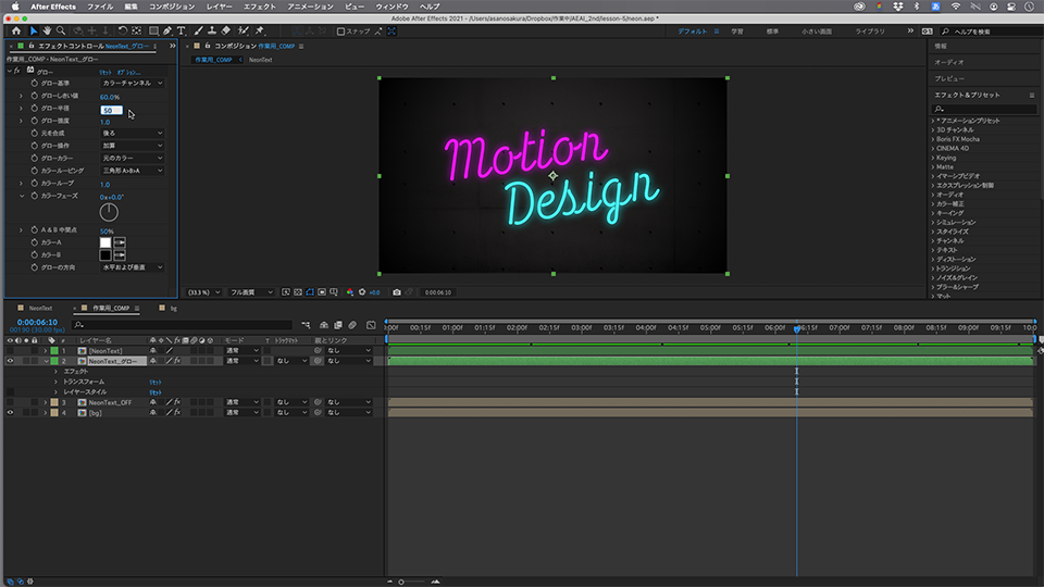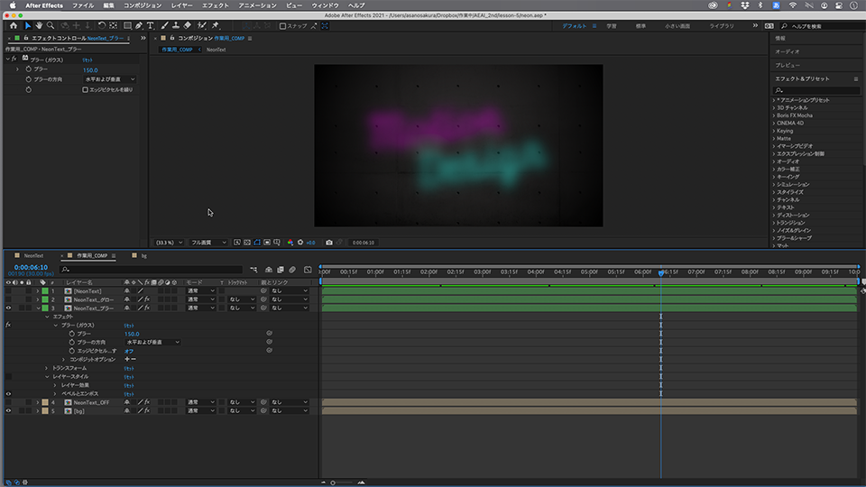 レイヤーパネルで項目を設定し、コンポジションパネルに反映される結果を見ながら調整していきます。このままでもネオンらしくはありますが、さらにネオンの発光を追加で作成していきます。