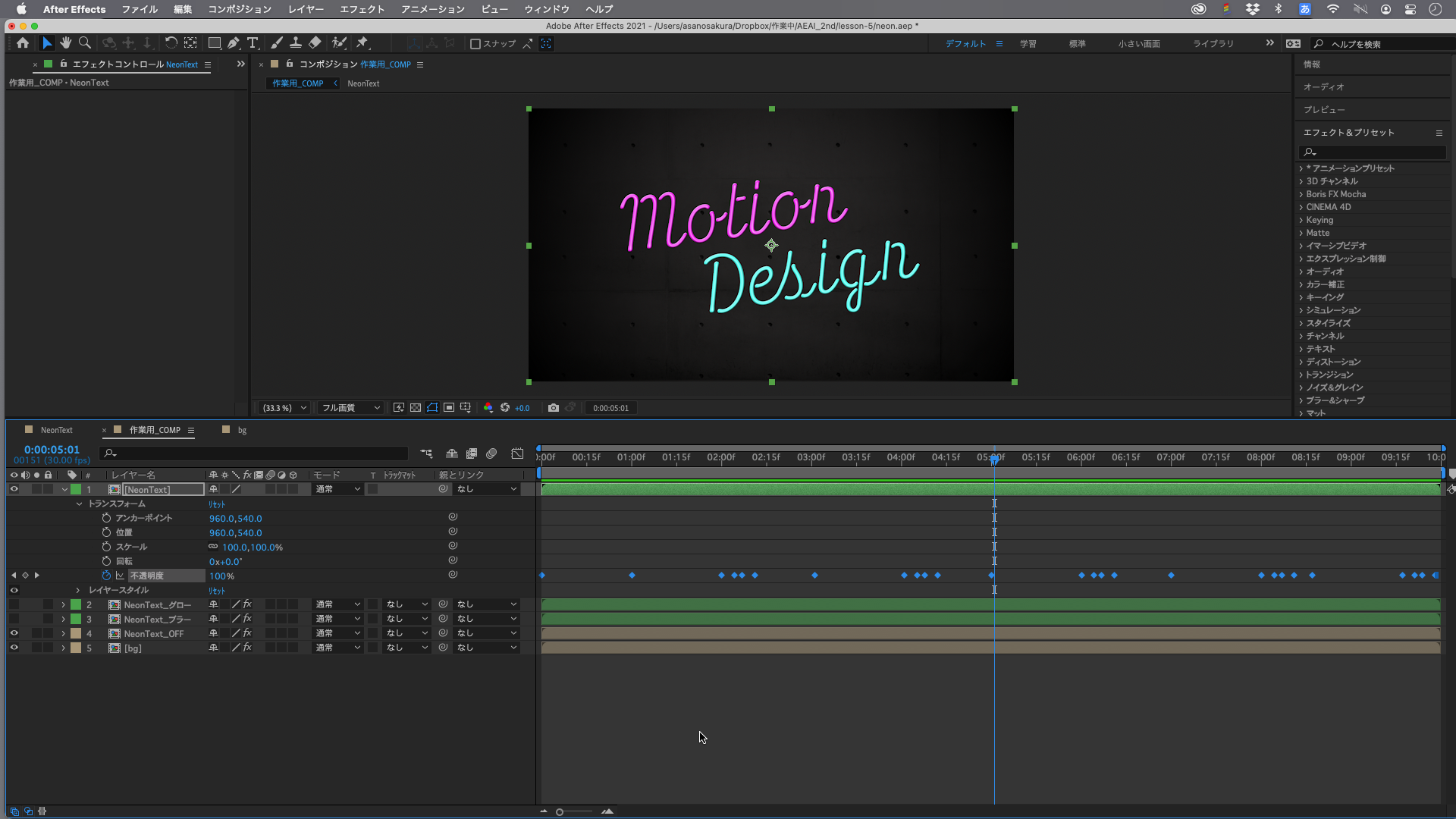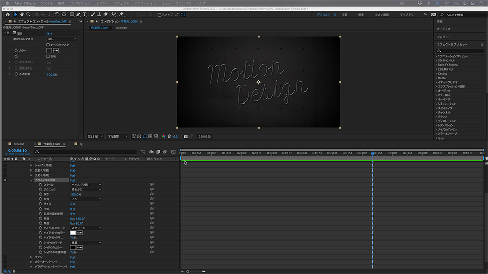 今後、5〜8の操作は、この「NeonText」を「作業用_COMP」のレイヤーパネルへドラッグ&ドロップしてレイヤーとして扱った上で、さらにレイヤーパネル上で「NeonText」を複製し、異なるレイヤースタイルやエフェクトを掛ける作業をおこないます。