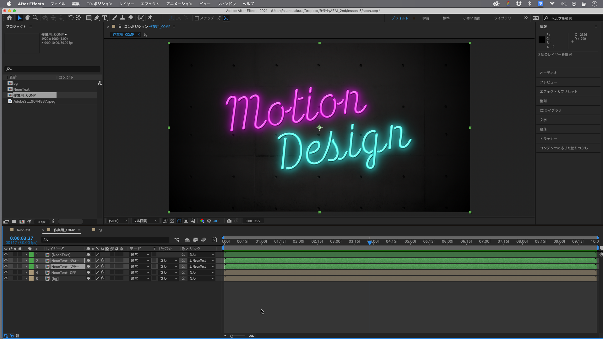 「作業用_COMP」コンポジション上で、プロジェクトパネルからレイヤーパネルへ「NeonText」をドラッグ&ドロップしてレイヤーとして追加します。