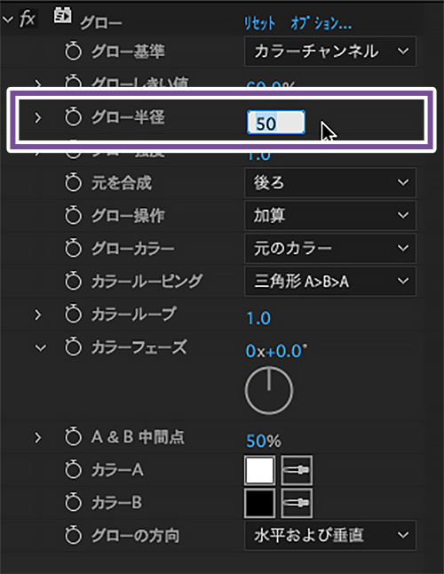 エフェクトコントロールパネルで「グロー半径」の数値を増やします。