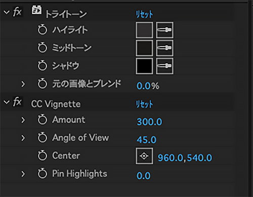 [エフェクト]メニュー→[カラー補正]→[トライトーン]を選択します。