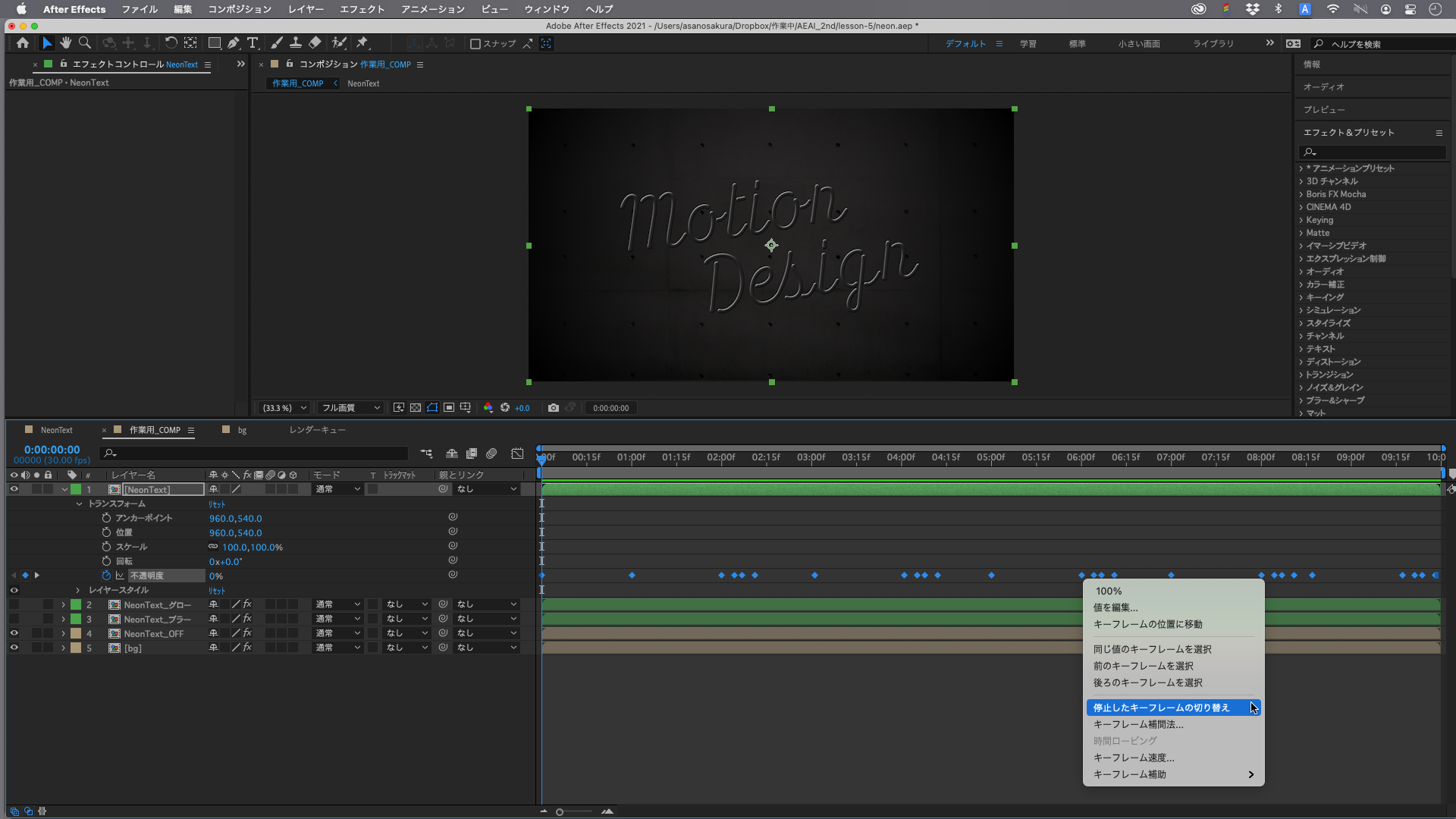 これを、パキッとしたON/OFFのモーションへ変更するには、キーフレームをすべて選択して右クリックし、「停止したキーフレームの切り替え」を選択します。