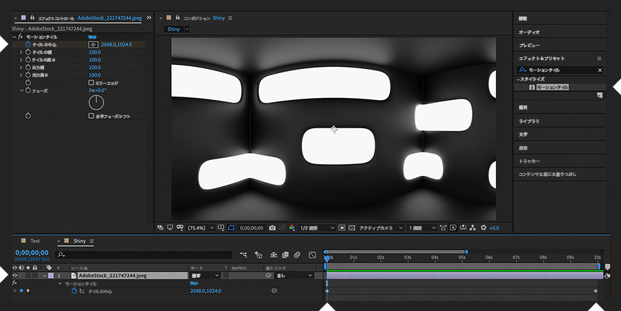 最終的なデザインを含める別のコンポジションを作成します。そこに光源となるスポットライトの画像をドラッグします(ライトパネルの3Dマップレンダリングなど)。そのレイヤーにモーションタイルエフェクトを適用して、「タイルの中心」(X値)のキーフレームをコンポジションのデュレーション全体に設定します。コンポジションを再生します。グラフィックが画面上を絶え間なく動きます。最大の効果を得るためにはゆっくり動かします。これが、文字やロゴデザインで反射する光の光源になります。
