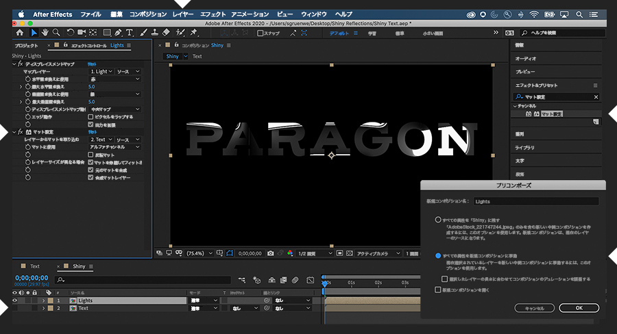 Adobe After Effectsで、光源の光を反射するテキストやロゴを作成します。