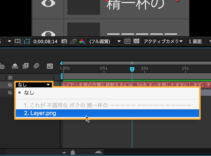 画像が動くとテキストも一緒に動くように「タイムラインパネル」でテキストレイヤーの「親プルダウン」から画像のレイヤーを選択し、親子関係を指定します。