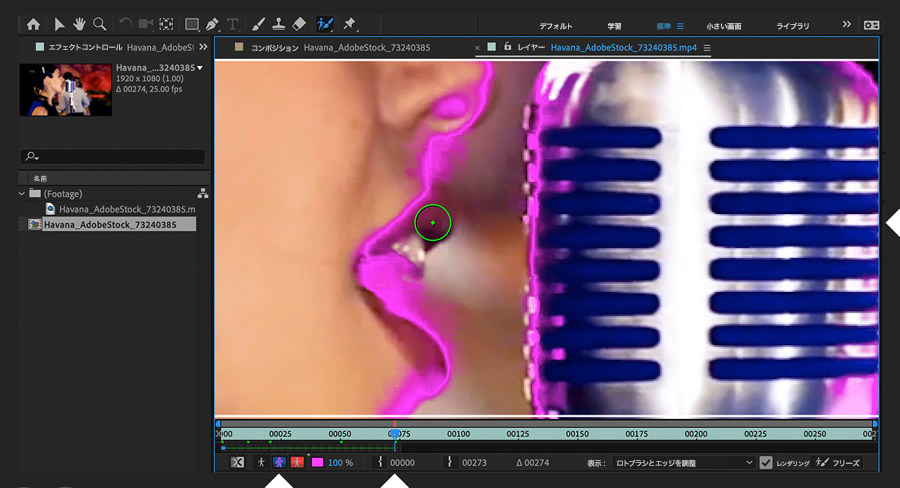 レイヤーパネルで小さな再生ヘッドを少しずつ(5~10フレームずつ)進めて、順方向にレンダリングします。緑色のレンダリングバーが再生ヘッドに追いつくまで待ちます。アルファ境界線ボタンに切り替えて、選択範囲が操作対象を適切に囲んでいることを確認します。ずれている場合は、ロトブラシツール(Option/Alt + W)キーを押して選択範囲の境界線を修正します。最終的に作業領域全体がレンダリングされるまで、灰色のトリミングスパン(伝達の方向)を徐々に再生ヘッドの前方に延長します。この部分が、一連の処理の中で最も時間のかかるところです。