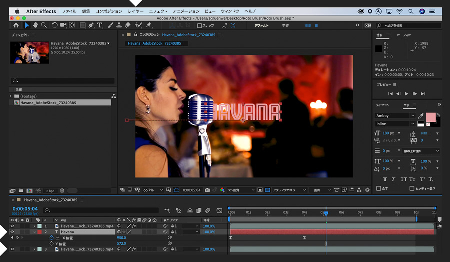 コンポジションパネルに切り替えます。分離したばかりの前景の被写体の背後にテキストを追加するために、ビデオレイヤーを複製し(command/Ctrl + D)、下のレイヤーからロトブラシエフェクトを削除します。間に新しいテキストレイヤーを追加し(レイヤー/新規/テキスト)、上のレイヤーの被写体の背後からテキストが現れるようにアニメーション化します。