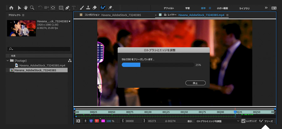 選択範囲の動きがコンポジションのデュレーション全体にわたって問題なくトラッキングされたら、レイヤーパネルで「フリーズ」をクリックして変更を保存します。