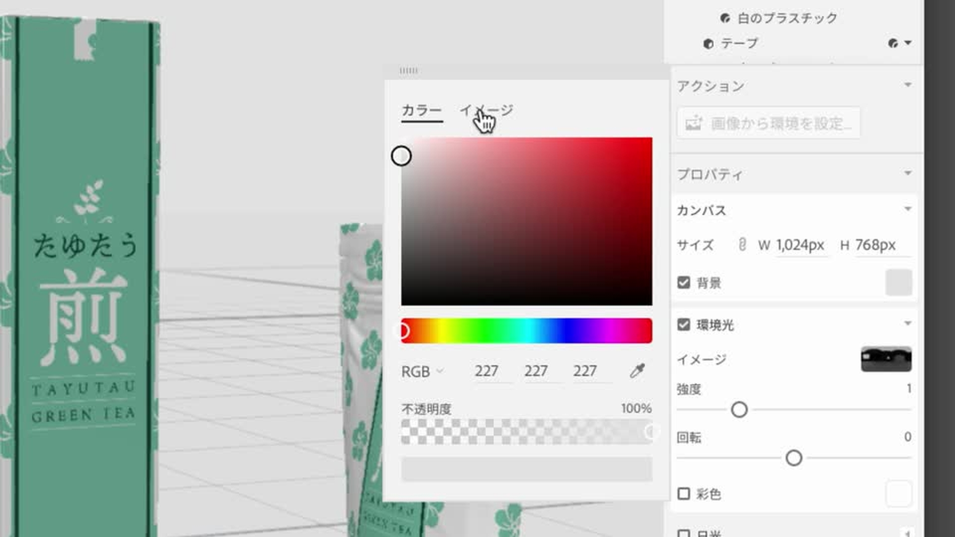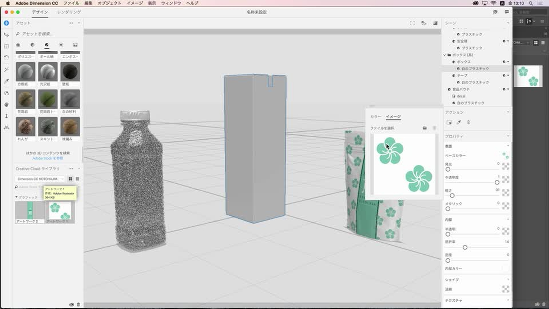 Illustratorで作成したパッケージデザインを、それぞれの3Dモデルに貼り付けていきます。ここでは、「Creative Cloudライブラリ」を使って簡単にIllustratorデータをDimensionに読み込み、モデルに貼り付けて位置や大きさを調整する方法を解説します。