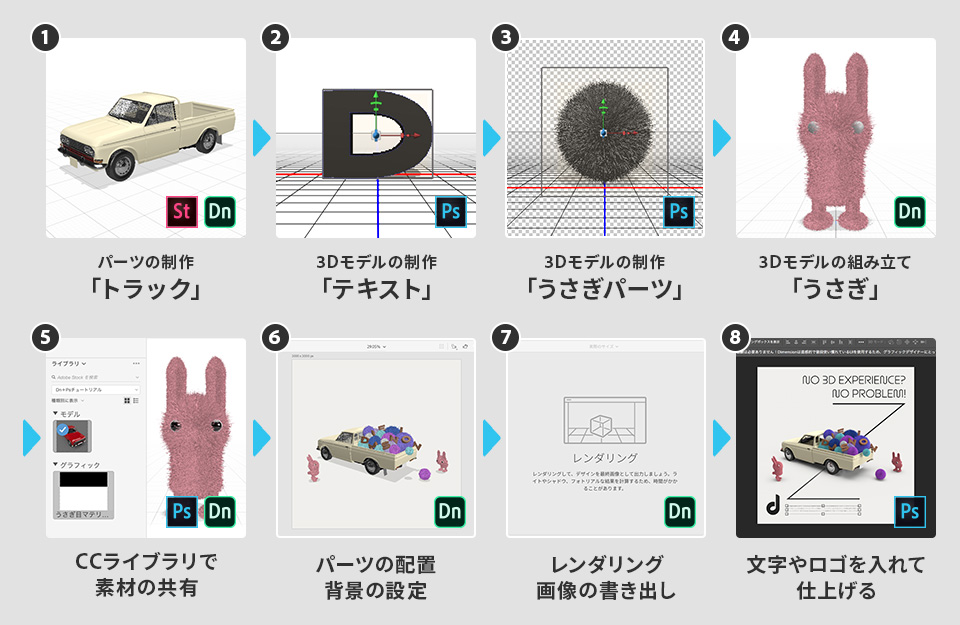 3Dモデルの配置、マテリアルの追加、カラーの適用、グループ化、3D押し出し、深度マップ、レンダリング、Creative Cloudライブラリ