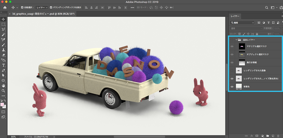 Dimensionで書き出したPSDデータをPhotoshopで開くと、いくつかのレイヤーに別れているのがわかりますこれらのレイヤーを使って、Photoshop上で様々な調整を行うことが可能です。