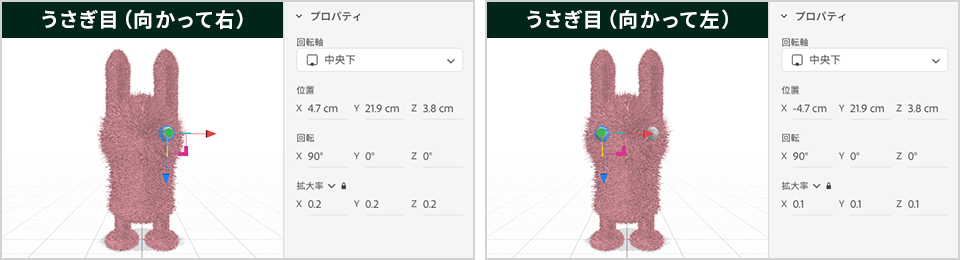 うさぎに目をつけていきます。アセットパネルの「モデル」から「球」を選択し、シーンに配置します。名称を「うさぎ目」とします。プロパティパネルで位置や大きさの設定をします。さらに、うさぎ目を複製して、同様に位置や大きさを調整します。
