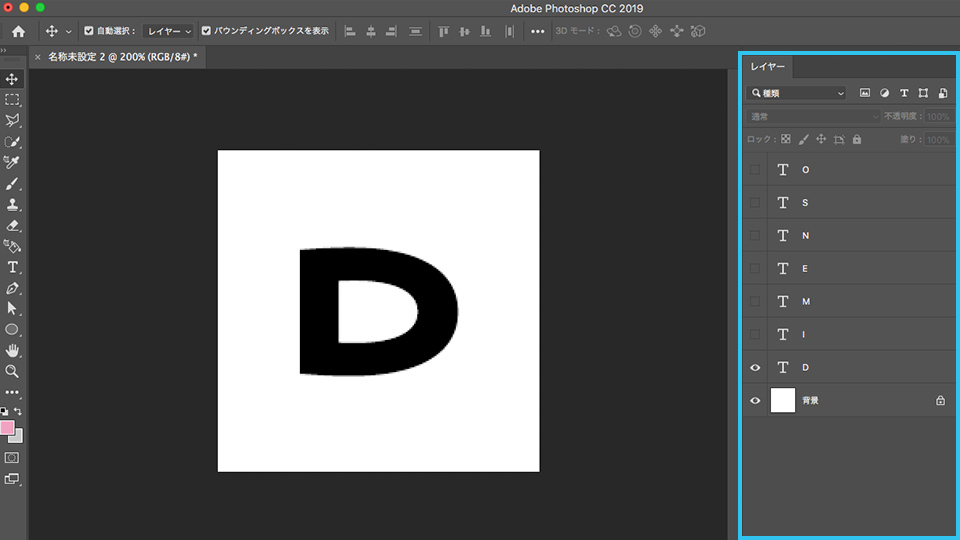 Photoshopを起動し、200×200px(RGB)の新規ドキュメントを作成します。文字ツールを選択し、任意のフォントを選んでフォントサイズ1 00pxで「D」「I 」「M」「E」「N」「S」「O」をそれぞれ別のレイヤーに作成します。作業しやすいように一旦すべてのレイヤーを非表示にします。