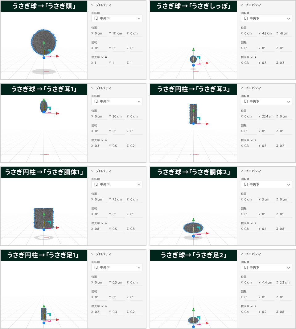 読み込んだモデル「うさぎ球」を5つ、「うさぎ円柱」を3つ複製します(Mac:command + D / Win : control + D)。 それぞれの名称を変更し、プロパティパネルで位置や大きさを設定します。