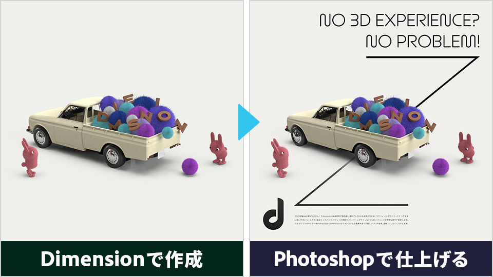 Photoshopでテキストやロゴ、ラインなどを加えれば、グラフィックスの完成です。今回は基礎から応用までの一例をご紹介いたしました。DimensionとPhotoshopを横断的に使用することで、表現の幅は爆発的に広がります。完成サンプルファイルを参考に、様々な3D表現にトライしてみてください。