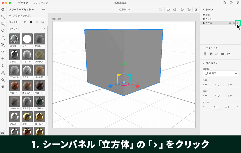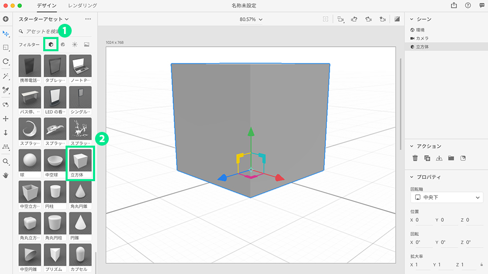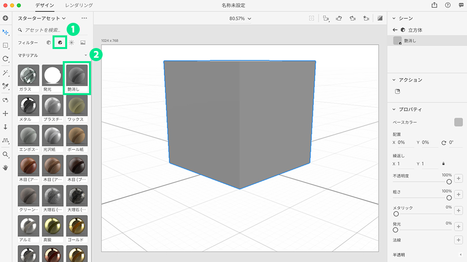 立方体のモデルが選択された状態で、アセットパネルで「マテリアル」アイコン①をクリックし、様々なマテリアルの中から「艶消し」②をクリックします。モデルにマテリアルが適用されます。