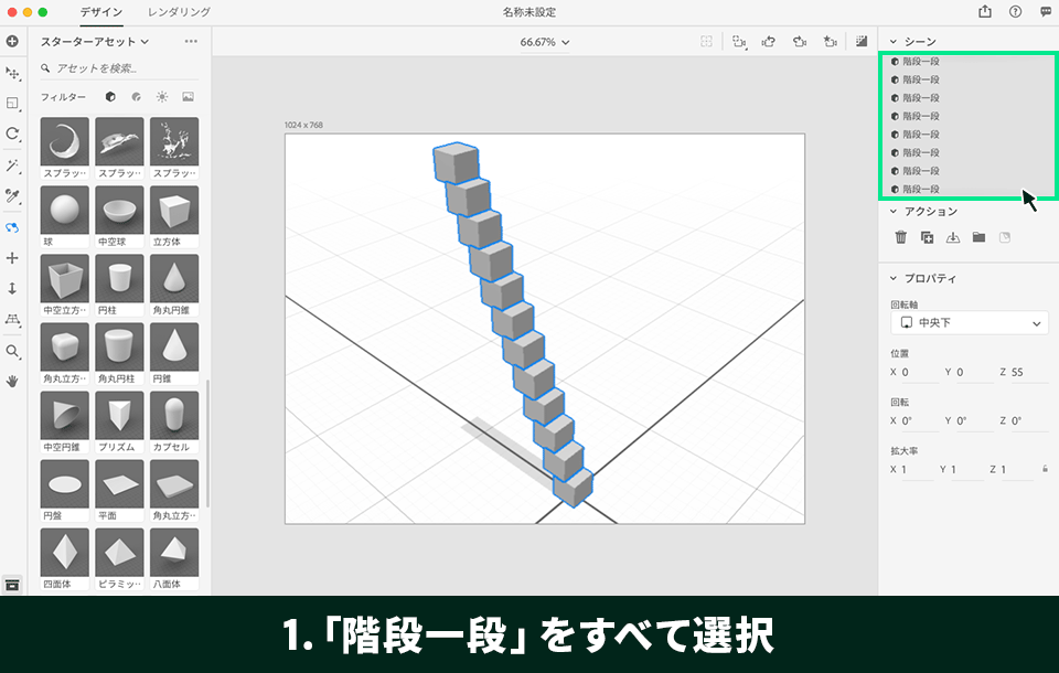 シーンパネルで12個の「階段一段」を全て選択し、アクションパネルの「グループ化」アイコンをクリックします。これで複数の「階段一段」が1つのグループにまとまりました。グループ名を「階段グループ」に変更します。