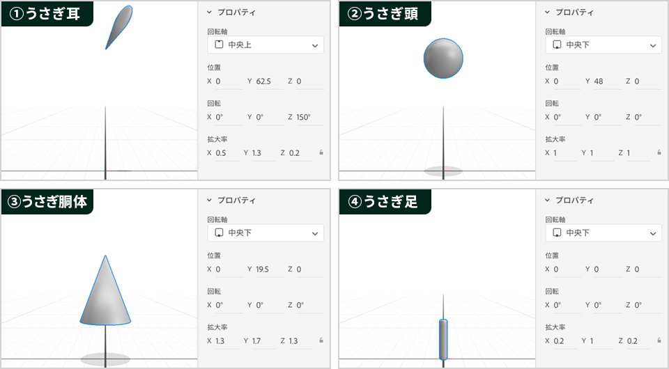 足と耳を複製して2つにします。「うさぎ足」と「うさぎ耳」をそれぞれ選択し、プロパティパネルで「回転軸」と「位置」を下図のように変更します。「複製」ボタンをクリックし、複製されたモデルを選択してさらに「位置」を変更します。