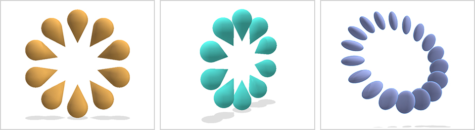 グループ化したオブジェクトに対して「回転軸」を設定することで、下図のような様々な形状のリングを作成することができます。色々と試してみましょう。