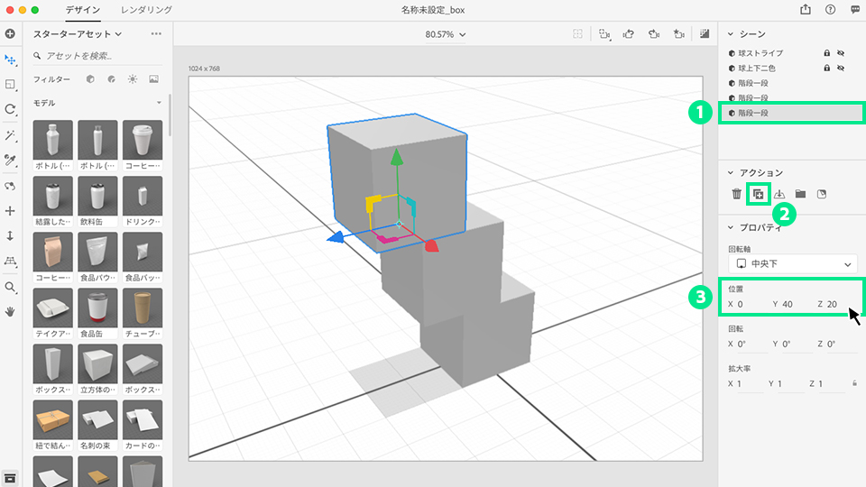 さらに階段を積み上げていきます。「階段一段」①を選択し、アクションパネルの「複製」アイコン②をクリック、プロパティパネルで位置を「X : 0/Y : 40/Z : 20」③に設定します。同様の操作を繰り返し、階段を12段積み上げていきます。モデルを複製するごとに、プロパティパネルで位置の「Y」を+20ずつ、「Z」を+10ずつ足していきます。