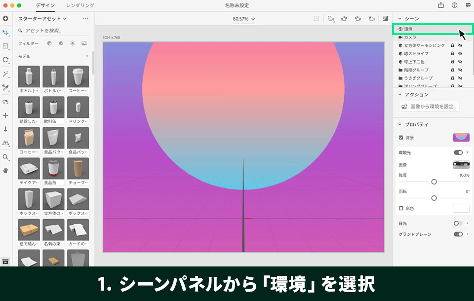 読み込んだ画像のサイズが大きいため、シーンからはみ出しています。シーンパネルで「環境」が選択されている状態で、アクションパネルの「画像から環境を設定」をクリックします。パネルが開くので、「カンバスサイズを変更」のセレクトボックスから「画像サイズ」を選択します。さらに「環境光を作成する」にチェックを入れ「OK」をクリックします。画像全体がシーンに表示され、背景に合った環境光が作成されました。さらにプロパティパネルで次の設定を行います。(環境光 ON、強度 200%、回転 82.5°、彩色 未使用)