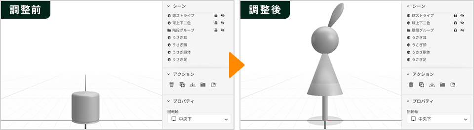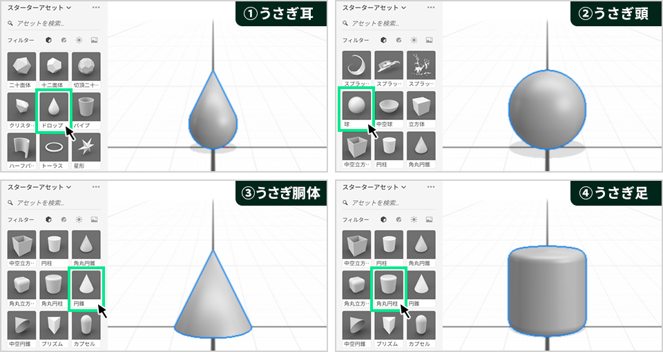 今度は複数の異なる形のモデルを組み合わせて、うさぎのキャラクターを作ってみましょう。次の4つのモデルをシーンに配置し、名称を変更します。「ドロップ」:うさぎ耳、「球」:うさぎ頭、「円錐」:うさぎ胴体、「角丸円柱」:うさぎ足