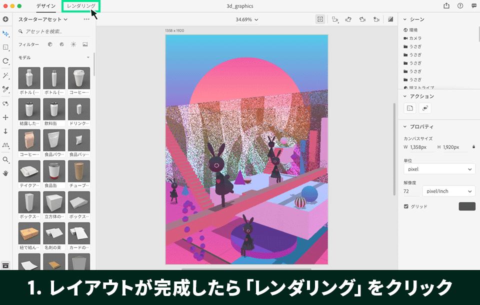 背景が設定できたら、作成してきたオブジェクトを表示し、位置やサイズを調整しながらレイアウトしていきましょう。完成したら、レンダリングを行います。ウィンドウ左上の「レンダリング」をクリックし、レンダリングモードに切り替えます。レンダリング設定パネルで、ファイル名、画質、場所、形式などを設定し、「開始」をクリックします。