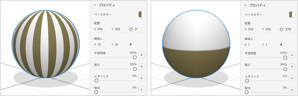シーンパネルで「艶消し」を選択した状態で、プロパティパネルで下図のような設定を試してみましょう。オブジェクトを複製するには、アクションパネルの「複製」アイコンをクリックします。同じ位置に複製されるので、ドラッグして位置を動かします。