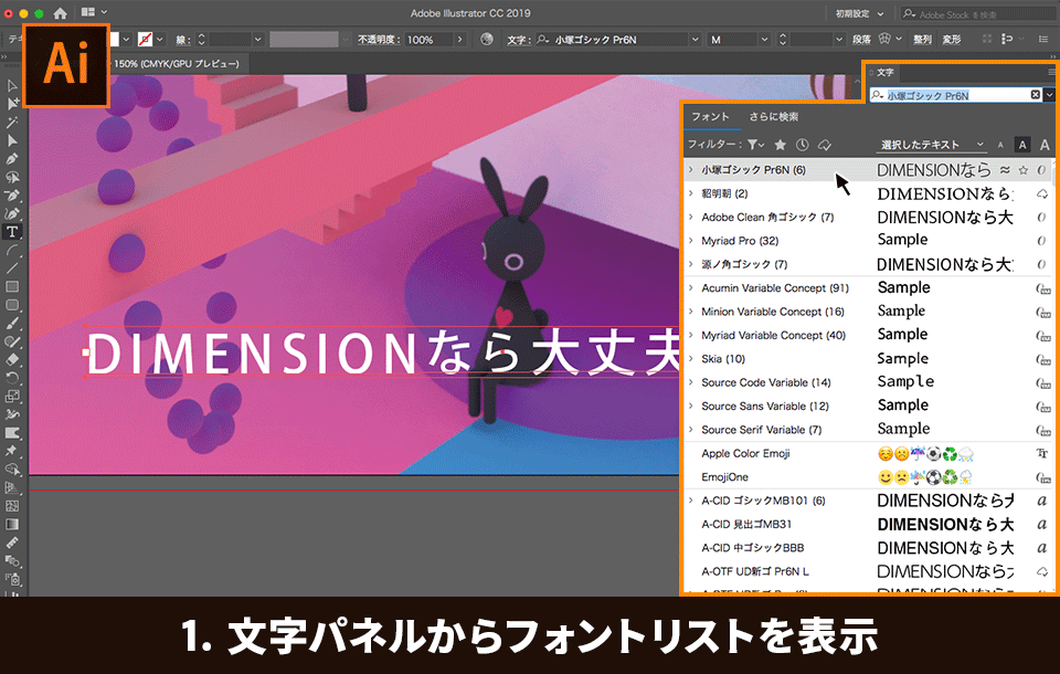 文字を入れてみましょう。Creative Cloudサブスクリプションに加入している方なら、「Adobe Fonts」というフォントサービスから好みのフォントを選択して使用することができます。