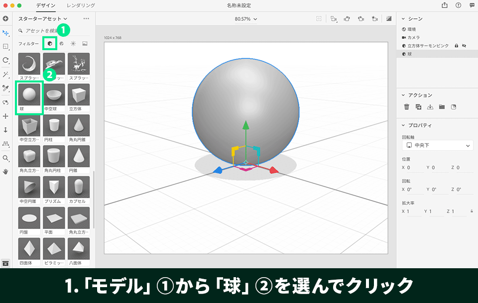 手順 1/7と同様の操作で、アセットパネルの「モデル」から「球」を選んでクリックします。次に「マテリアル」から「艶消し」をクリックして適用します。