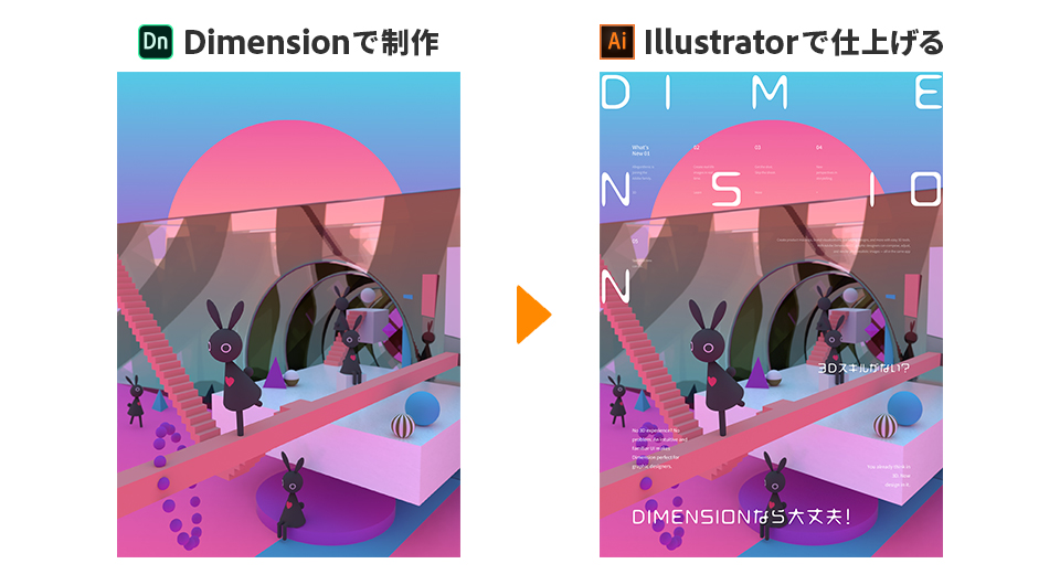 文字を入れたら、ポスターの完成です。いかがでしたか。Dimensionを使えば、3D経験のない方でも簡単に3Dグラフィックを作成できることがご理解いただけたかと思います。ここでご紹介した作例はほんの一部にすぎません。完成見本ファイルを参考に、様々な3D表現にトライしてみてください。