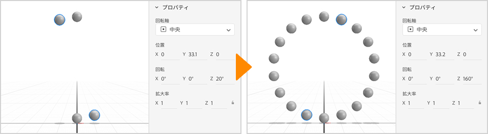 続けて「球グループ」を複製し、プロパティパネルで回転軸を「中央」にして、「回転」の数値を変更します(X : 0°/Y :0°/Z : 2 0°)。