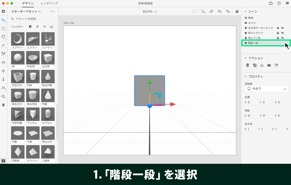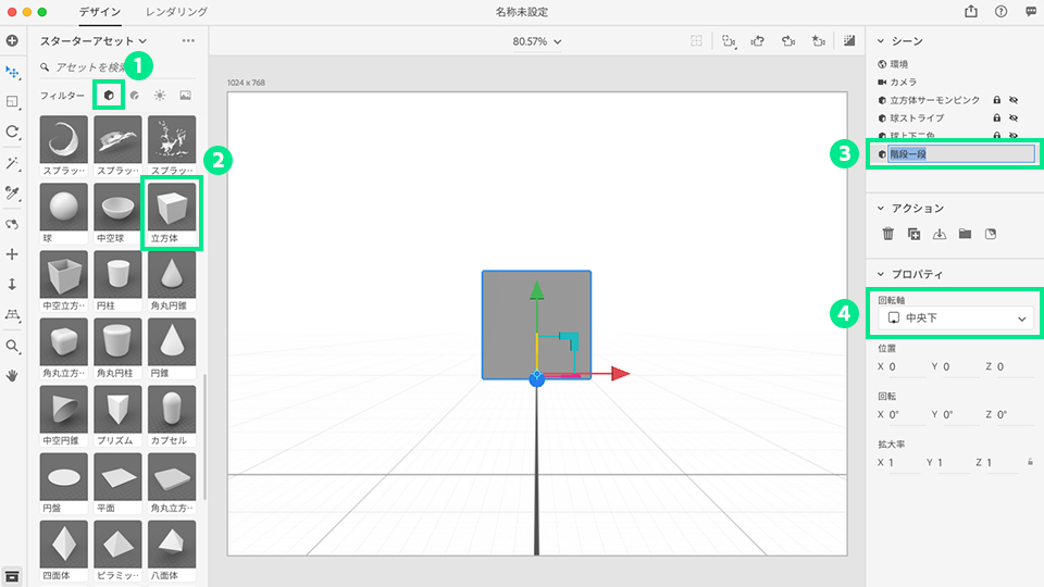 アセットパネルの「モデル」①から「立方体」②をクリックします。立方体モデルを正面から見た状態、つまり正方形の状態で配置されます。シーンパネルで「立方体」をダブルクリックし、「階段一段」③に名称を変更。次にプロパティパネルで回転軸が「中央下」④になっていることを確認しましょう。