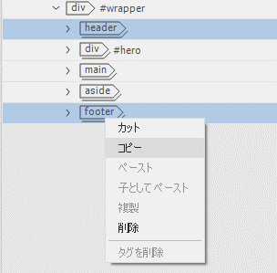 必要に応じてindex.htmlを保存します。次に、Ctrlキー(Windows)またはCmdキー(macOS)を押しながら、DOMパネルでheaderおよびfooter要素を選択します。headerおよびfooterの内側にネストされる要素は自動的に選択されますが、他の要素が選択されていないことを確認してください。