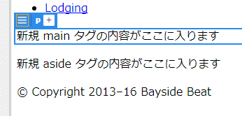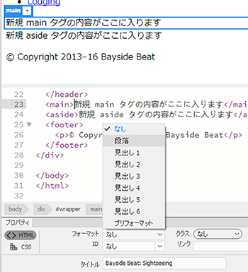 Dreamweaverに戻ります。手順1でフォーマットした段落がそのまま選択されていることを確認します。編集モード(オレンジの枠)になっている場合はEscキーを押して編集モードを抜けて青い枠にします。エレメントディスプレイには、main ではなく、p と表示されているはずです(図14を参照)。