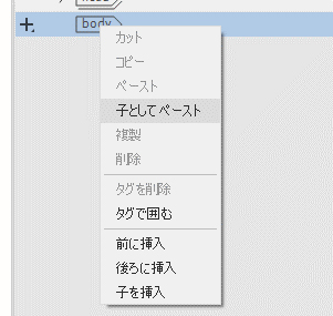 sights.htmlをアクティブドキュメントにしたまま、DOMパネルでbodyを選択し、右クリックして「 子としてペースト 」を選択します(図10を参照)。これで、コピーされた要素が2ページ目のタグの内部にネストされます。