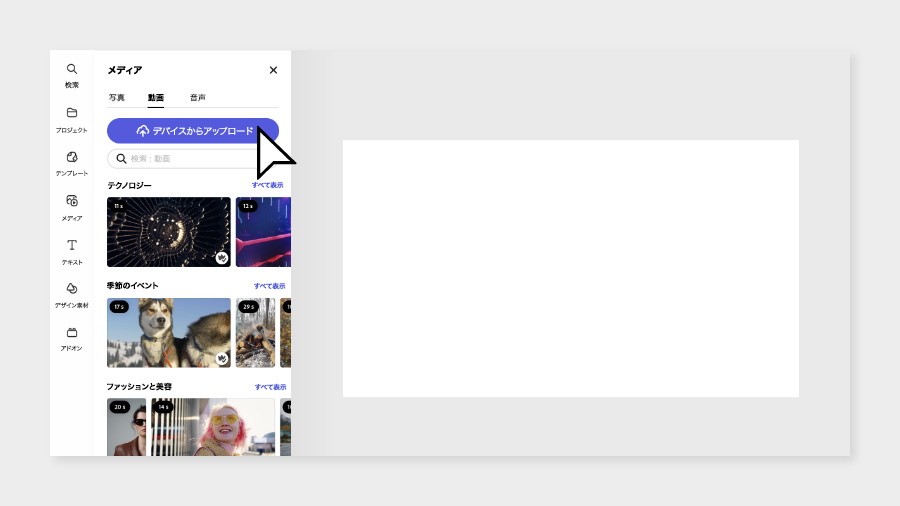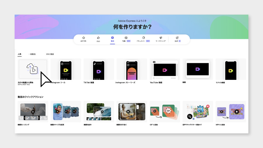 もうひとつのオプションでは、Adobe Expressライブラリのコンテンツをベースに新しいビデオを制作します。左上の青いボタンから作成メニューを開き、新規作成タブで「 すべて表示 」をクリックします。動画のなかから好みの形式を選択します。Adobe Stockで利用可能な何千ものビデオの中から検索して選択します。