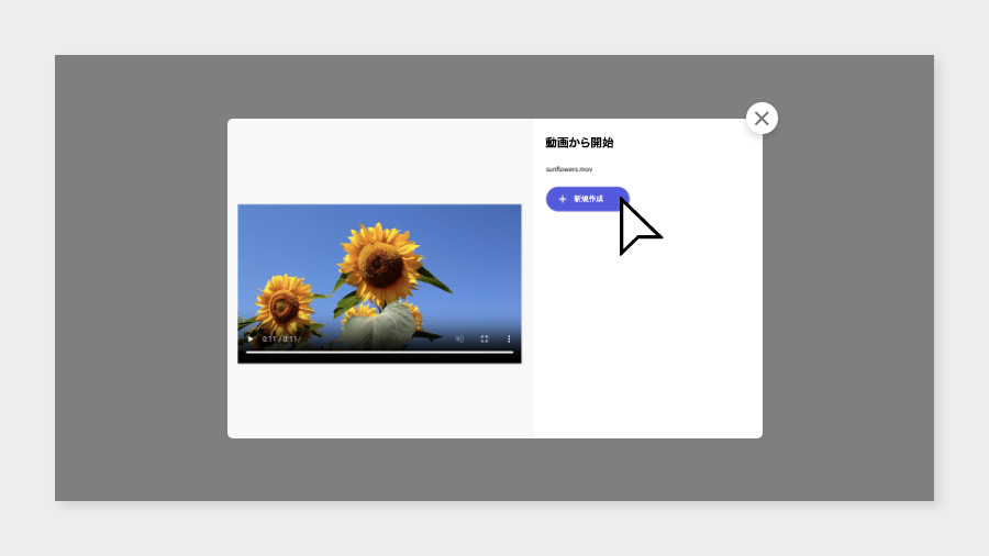 お使いのデバイスから動画を追加し、「 新規作成 」をクリックして、形式を選択します。制作したいものが具体的にイメージできていない場合は、「元の縦横比」から始めることをおすすめします。